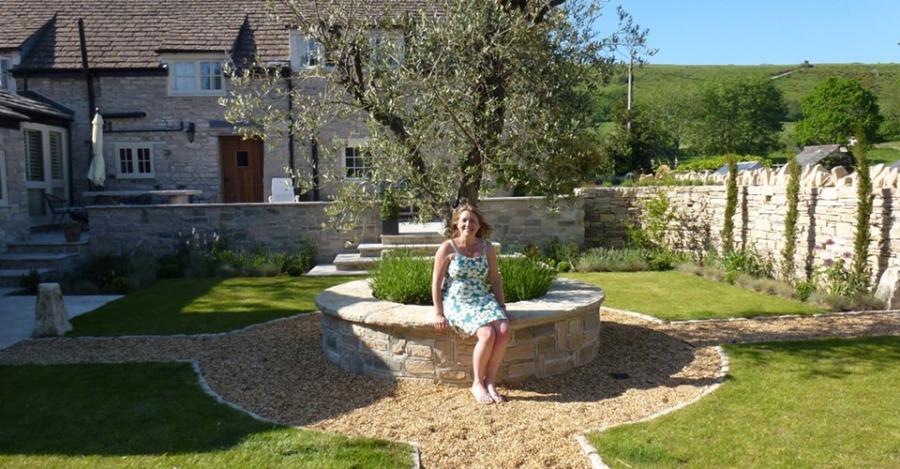 A Mediterranean style garden with a circular Purbeck stone raised bed with seating to encompass a 100-year-old olive tree from Italy.