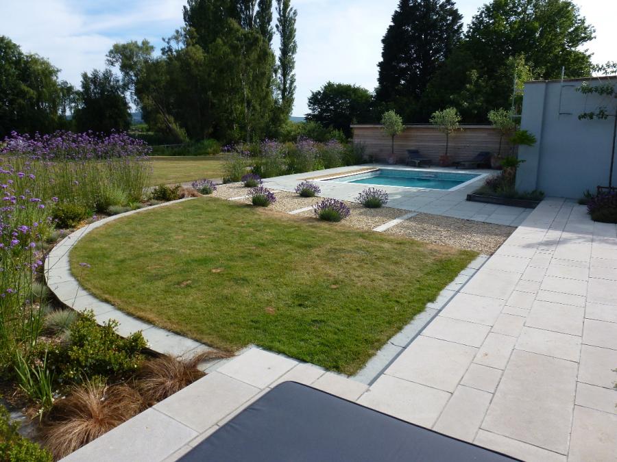 A Mediterranean and contemporary theme has been created for this terraced patio garden and new training pool next to the River Frome.