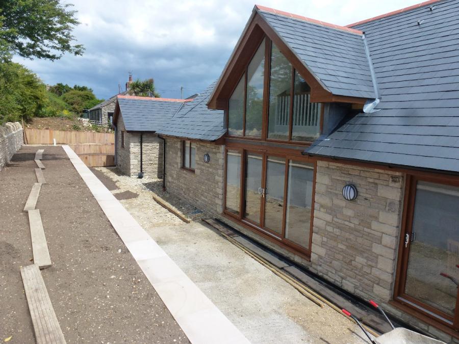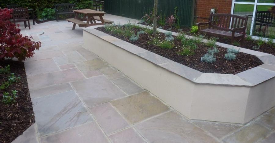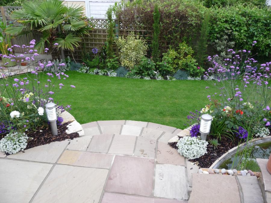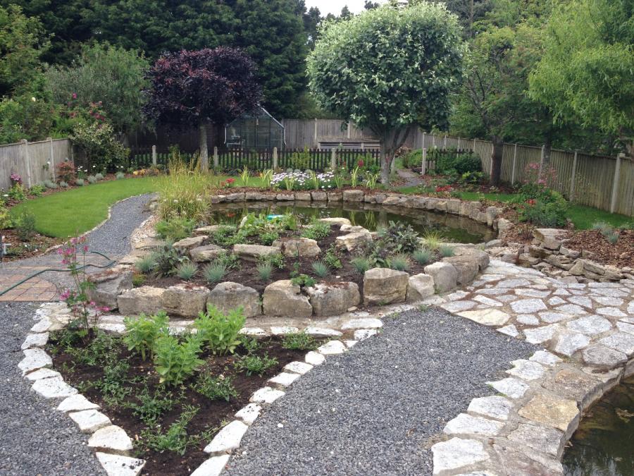 A ‘Contemporary’ theme with curves and soft flowing lines. The main feature is a pond with Purbeck stone walls and Sandstone paving.