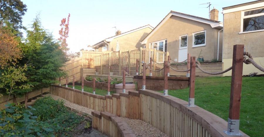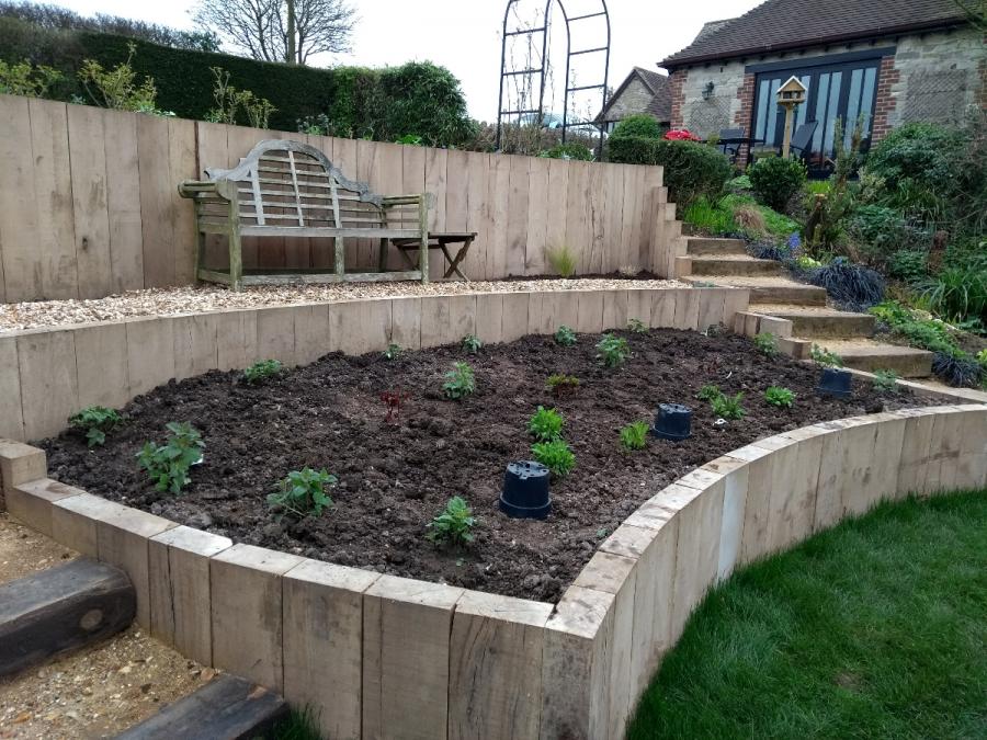 A high terraced garden was designed with curved vertical sleepers and steps to complement a new build, including a lawn terrace, planting areas, and a patio.
