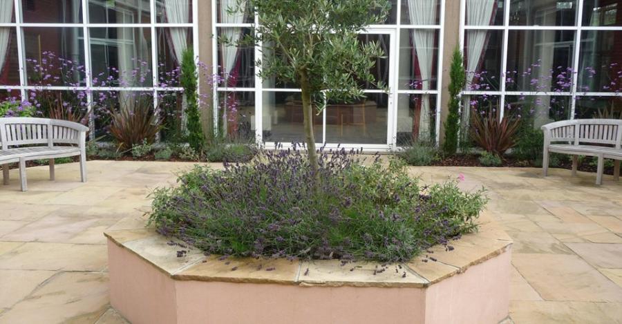 A Mediterranean style garden with a circular Purbeck stone raised bed with seating to encompass a 100-year-old olive tree from Italy.