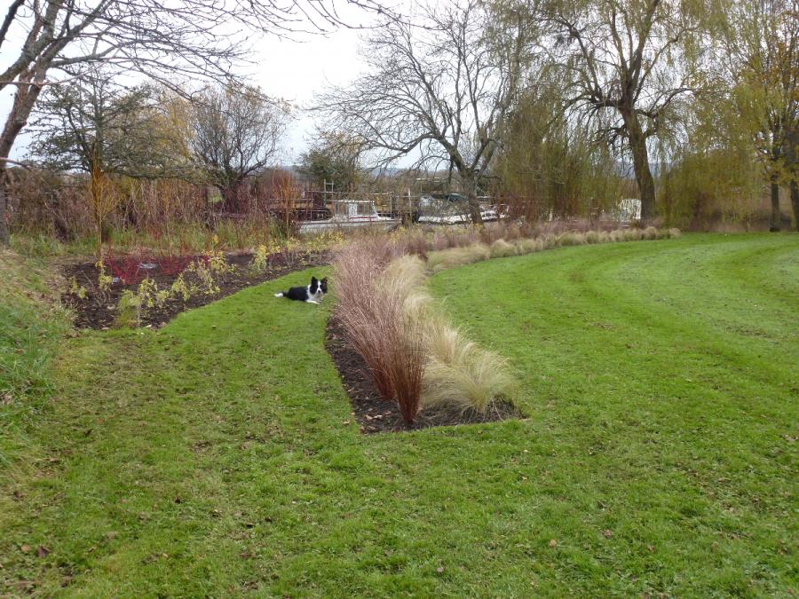 An eye catching curved grass path with hardy grasses planted on either side was designed on the banks of the River Frome with colourful Dogwoods.