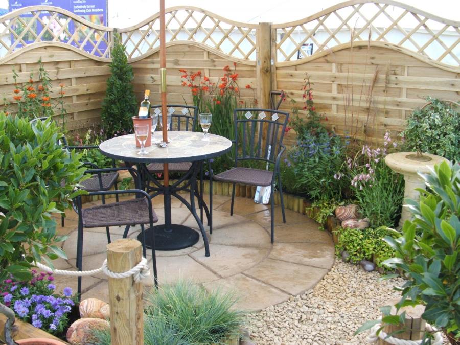 My first Show Garden with a patio area, table and chairs surrounded by a fragrant cottage garden complete with a bottle of wine and glasses!