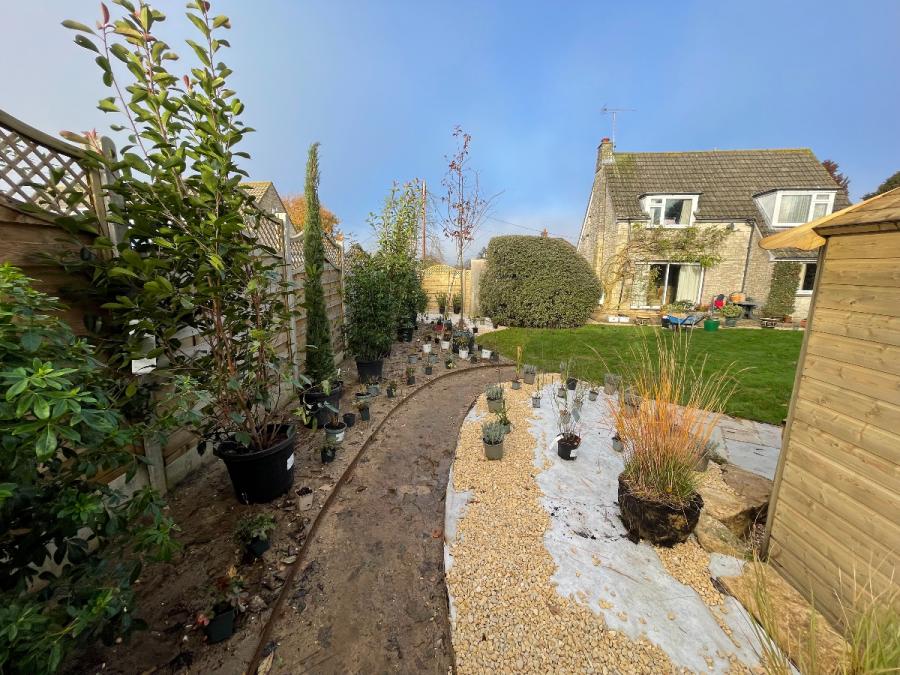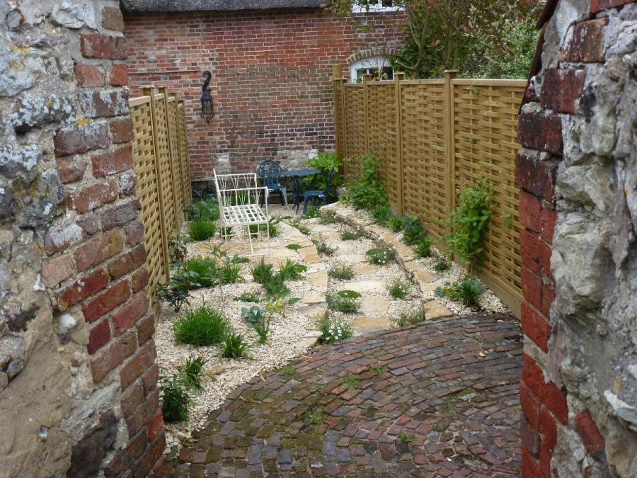 This once very narrow garden became a beautiful, stunning and scented cottage garden with a curved path, two seating areas and new woven fencing