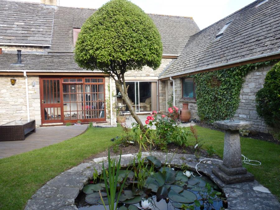 This lovely cottage-walled garden is informal, with a pond and fountain, and is lit up in the evening. The decking is made of composite.
