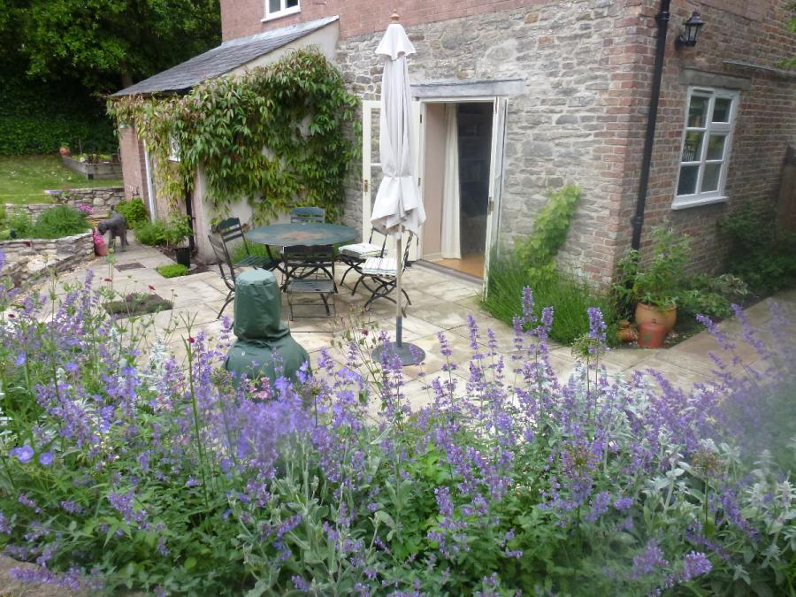A Mediterranean and contemporary theme has been created for this terraced patio garden and new training pool next to the River Frome.