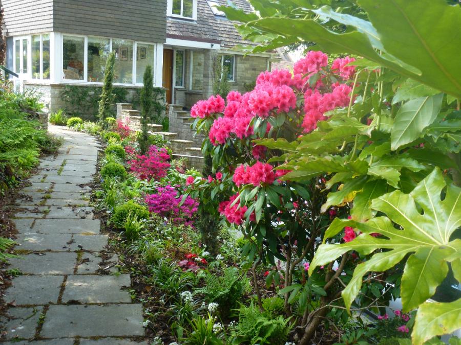 Designed for easy maintenance to incorporate mature shrubs and trees and summer house with all year round plant interest and colour.