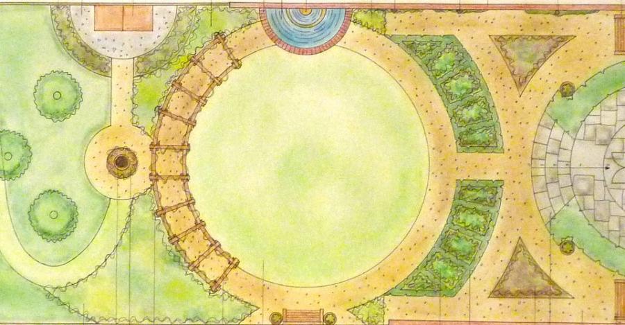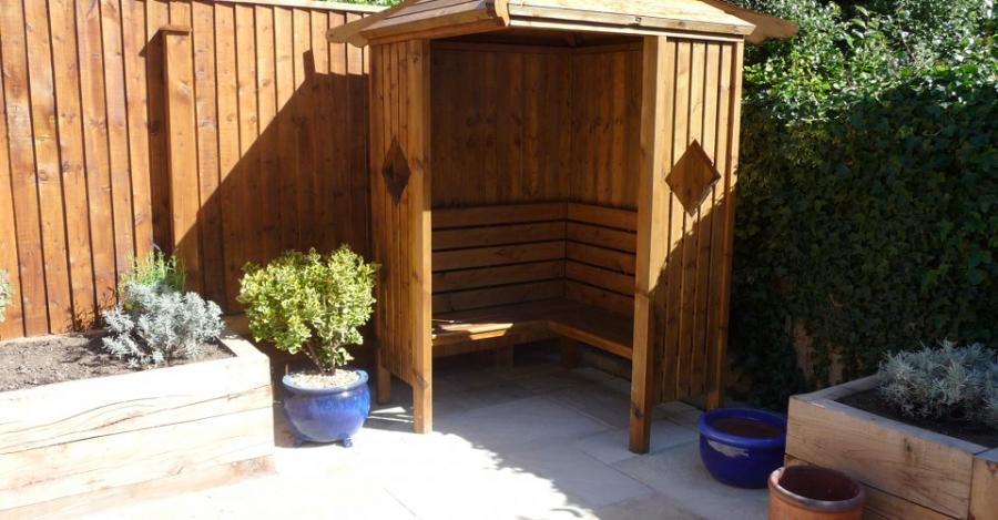 An easy-maintenance garden has been designed to incorporate a circular paved patio, raised wooden beds, and a corner arbour for relaxing in.
