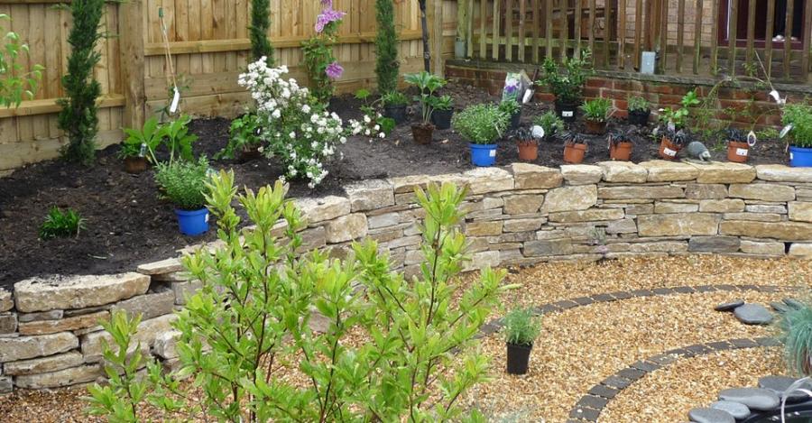 Curved lines have been designed for this stepped garden incorporating Purbeck stone, sandstone paving, lighting, a gazebo, and vegetable garden.